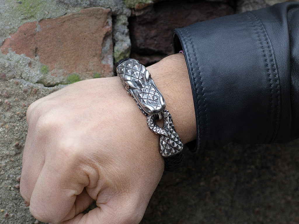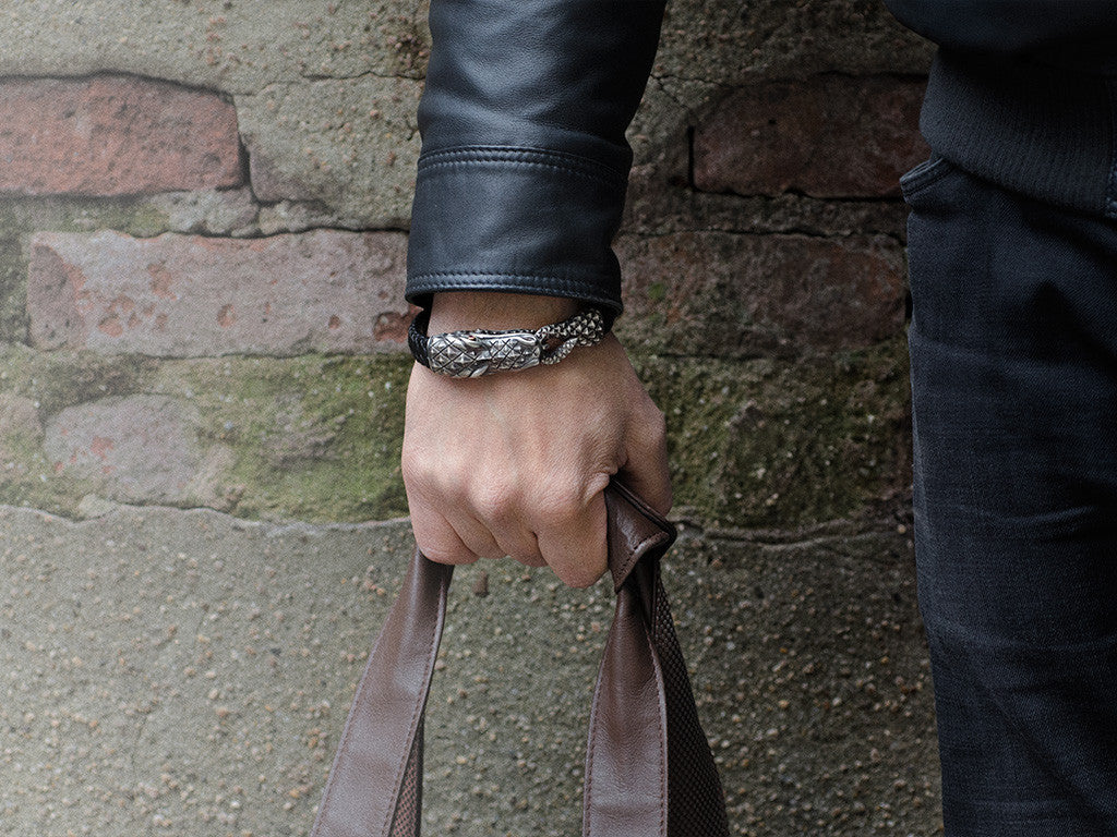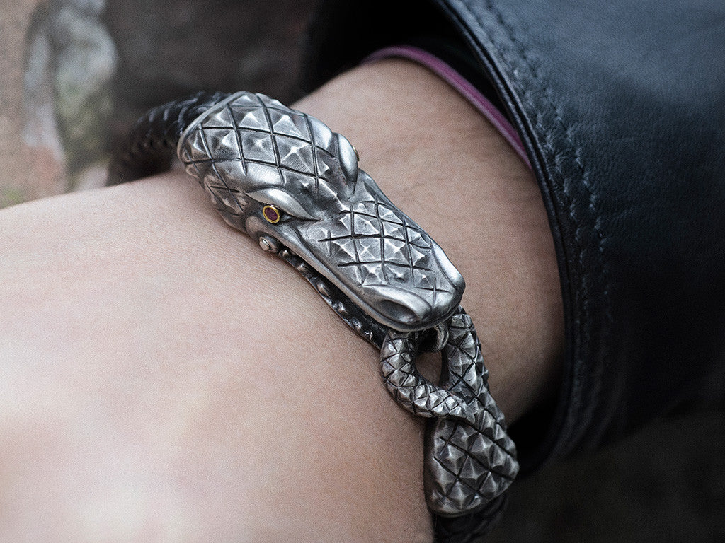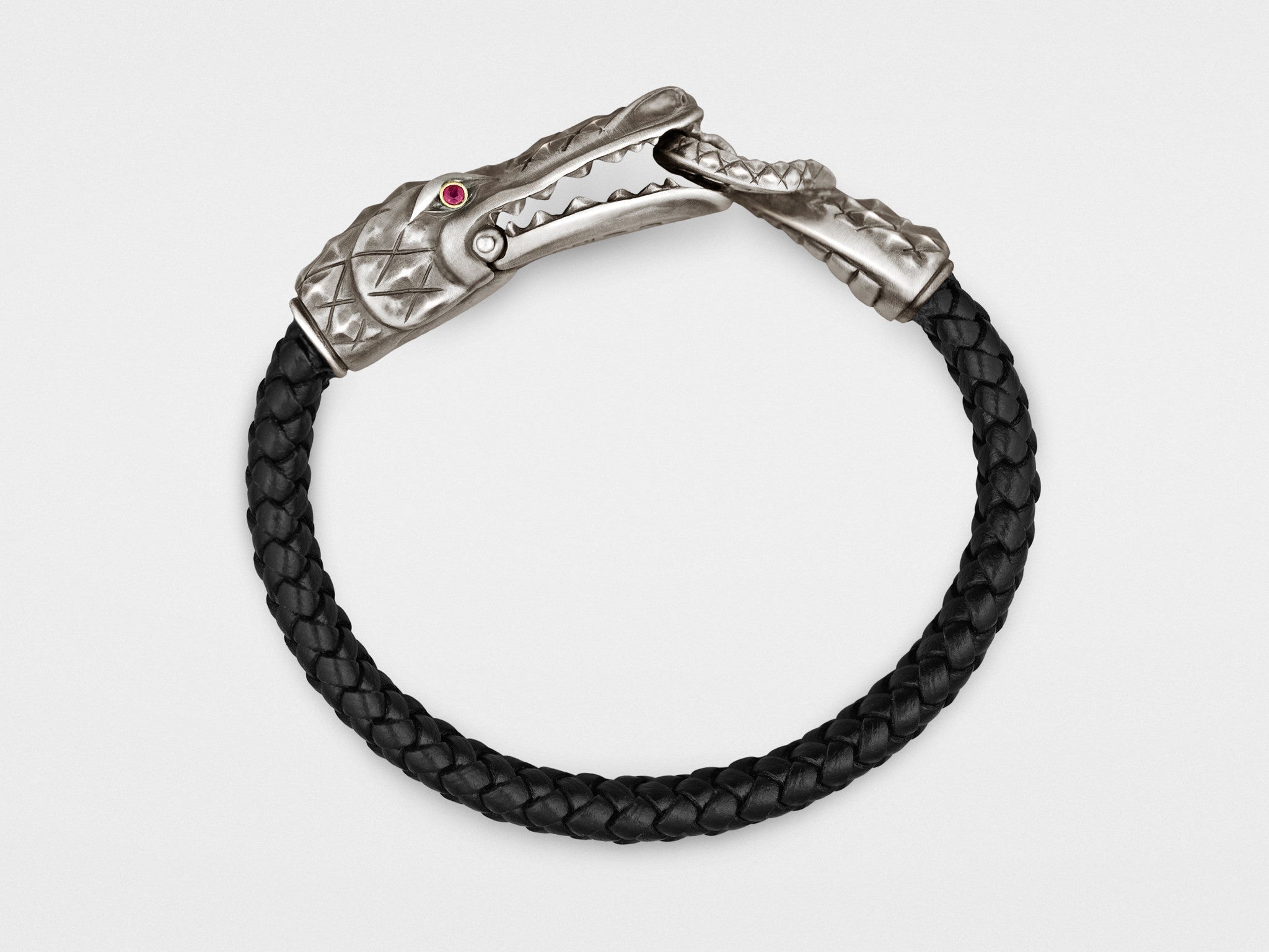 Inspiriert vom stahläugigen prähistorischen Raubtier, sieht dieses Lederarmband mit übergroßem Alligatorverschluss aus 925er Sterlingsilber absolut authentisch aus. Das außergewöhnlich detaillierte Schmuckstück, besetzt mit zwei Rubinaugen in 18-karätigen Goldfassungen, wird in unserer Werkstatt in New York City auf Bestellung gefertigt.