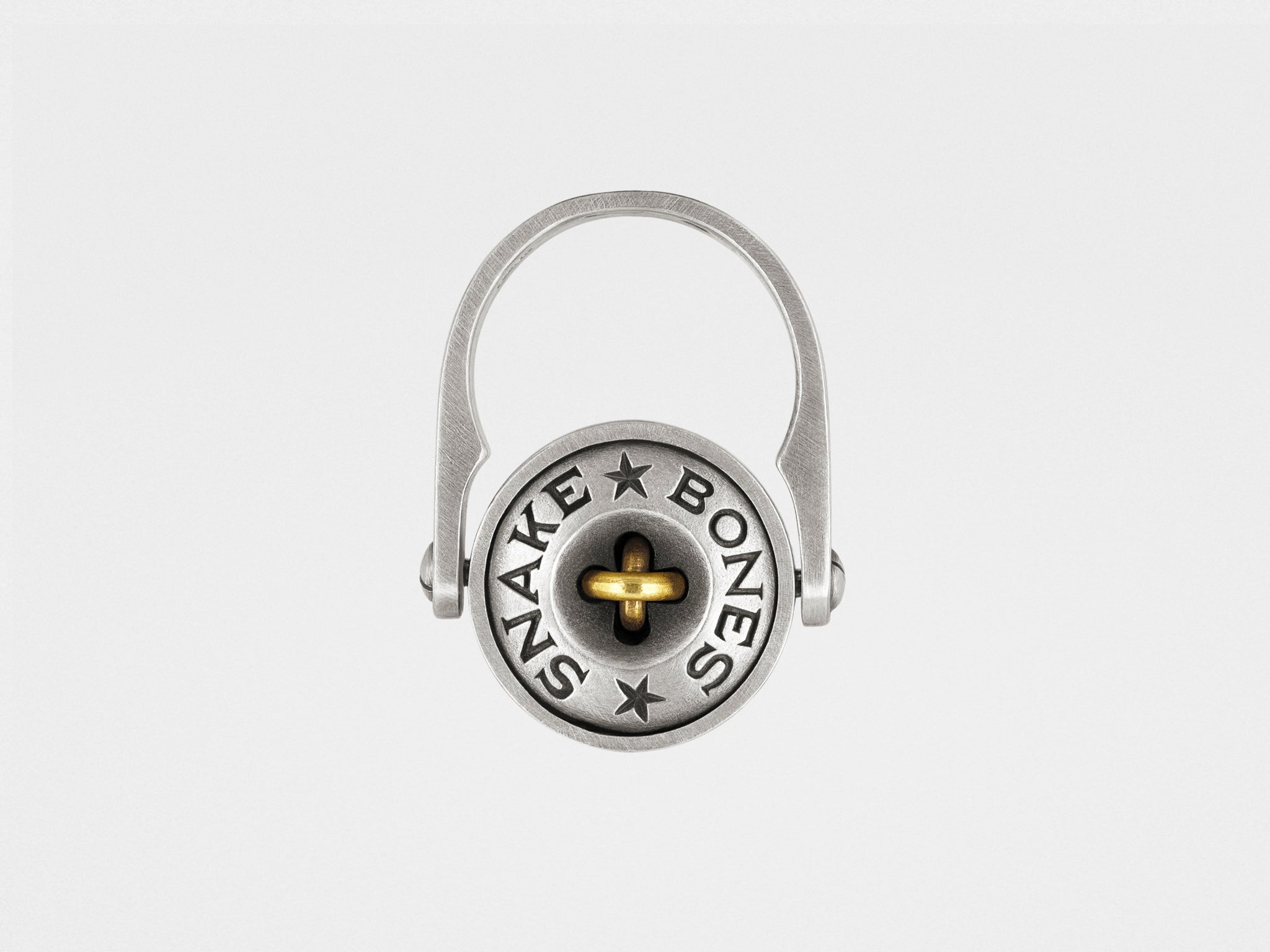 Doppelseitiger Ring aus Sterlingsilber und Messing mit gebürsteter, oxidierter Oberfläche. Durch Wenden lässt sich die Seite mit dem Knopf und die Seite mit dem Stein für zwei unterschiedliche Looks gestalten. Erhältlich mit und ohne Gravur „SNAKE BONES“. Bitte geben Sie Ihren Wunsch in einer Anmerkung zu Ihrer Bestellung an. Massives 925er Sterlingsilber und Messing. Oxidierte, matte Oberfläche. Erhältlich in den Größen 8–12 (US).