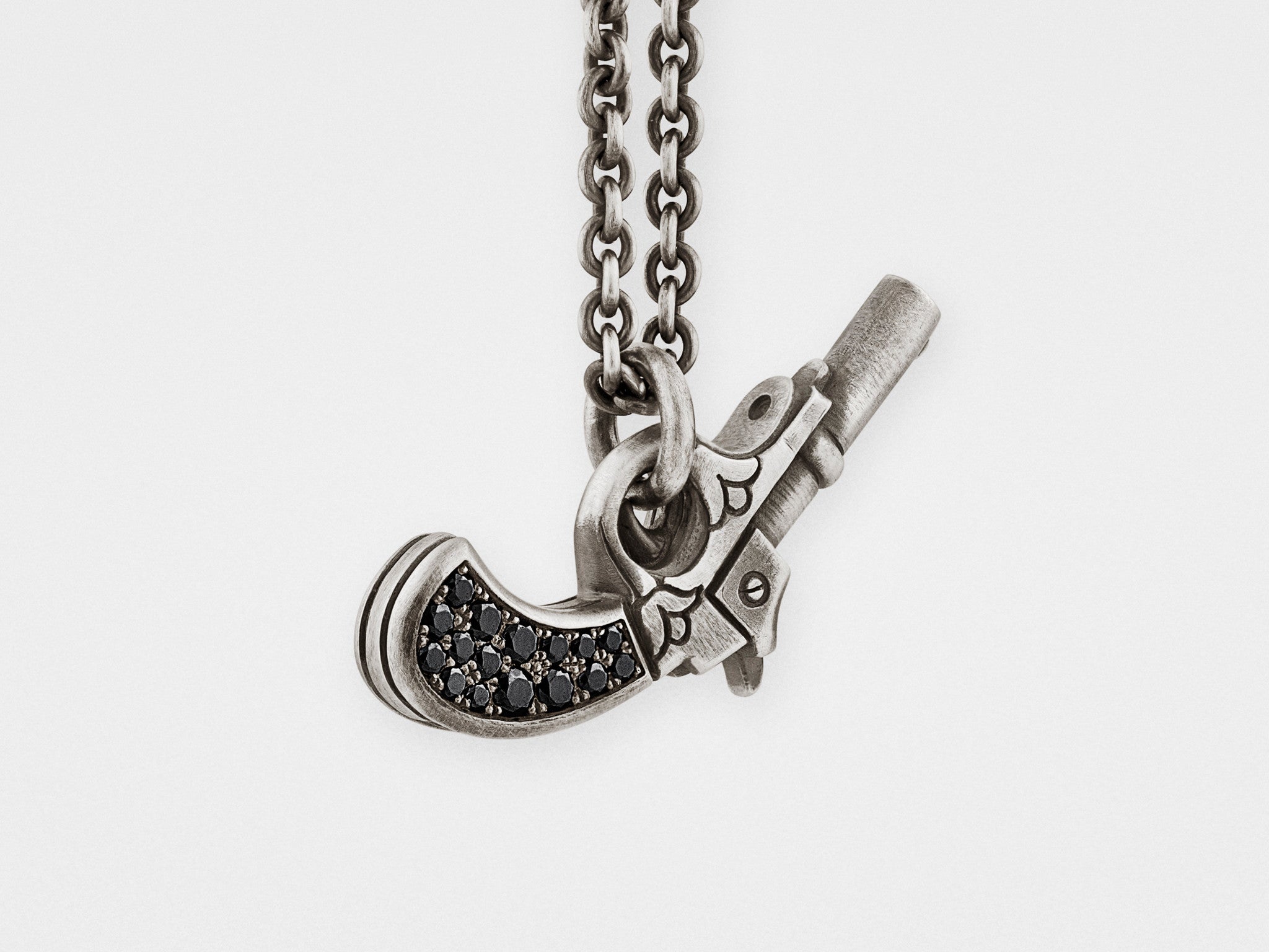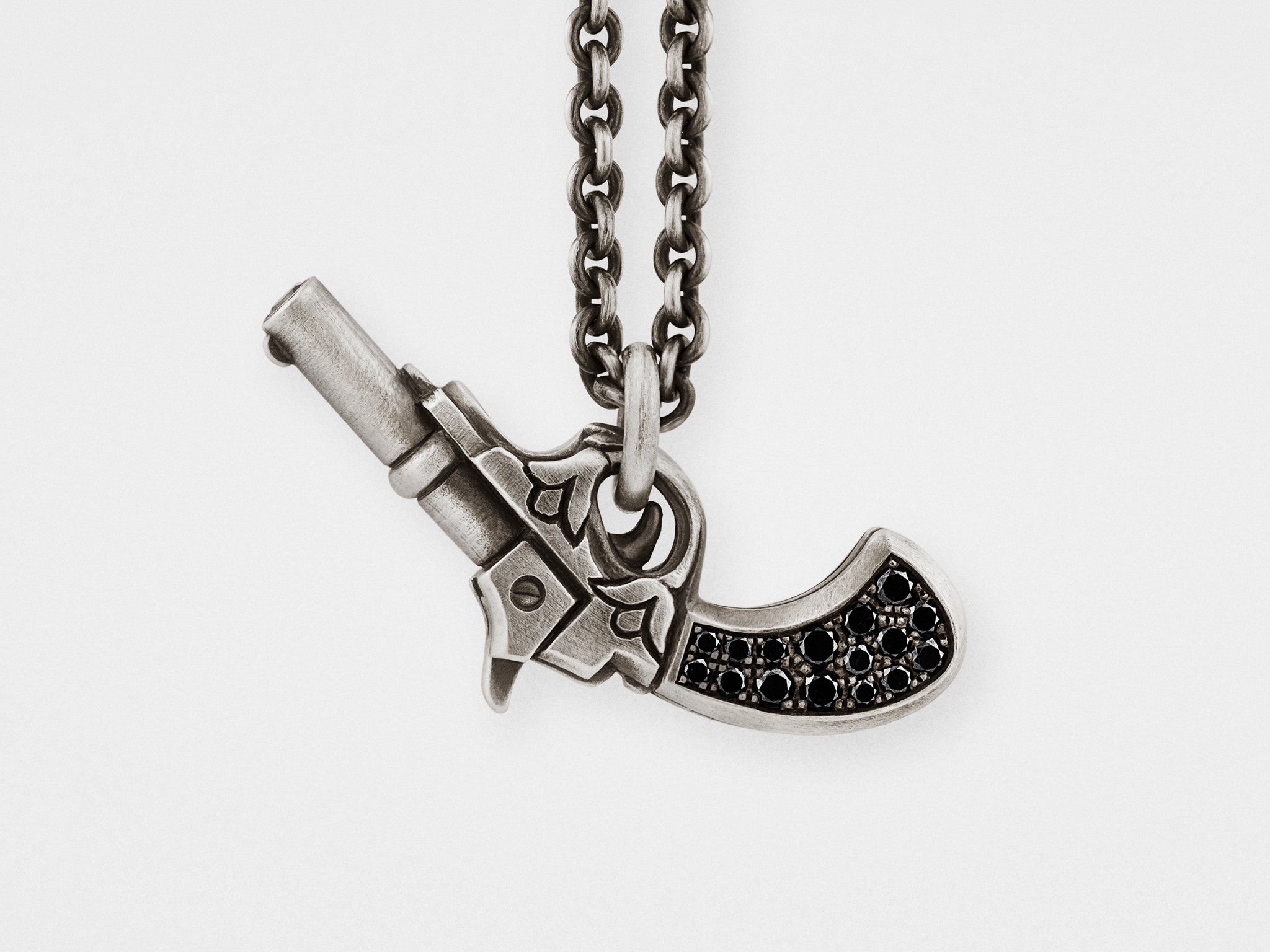Beide Seiten dieses handgeschnitzten Pistolenanhängers sind mit schwarzen Diamanten in einer wunderschönen Royal-Pavé-Fassung besetzt. Ein weiterer Diamant ziert den Lauf der Pistole, wodurch das Gesamtgewicht der Diamanten fast ein Karat beträgt.
