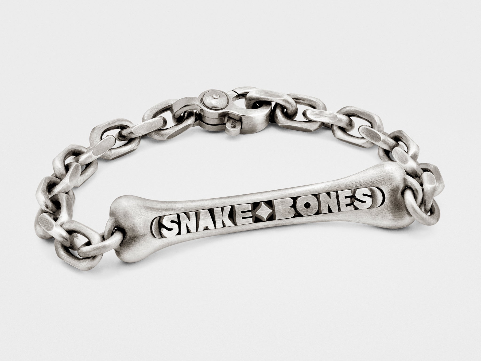 Seit Anbeginn der Zeit schmückten sich unsere Vorfahren mit Trophäen. Dieses handgefertigte Knochenarmband ist unsere verspielte Interpretation eines uralten Motivs. Gefertigt aus patiniertem Sterlingsilber für einen Vintage-Look.
