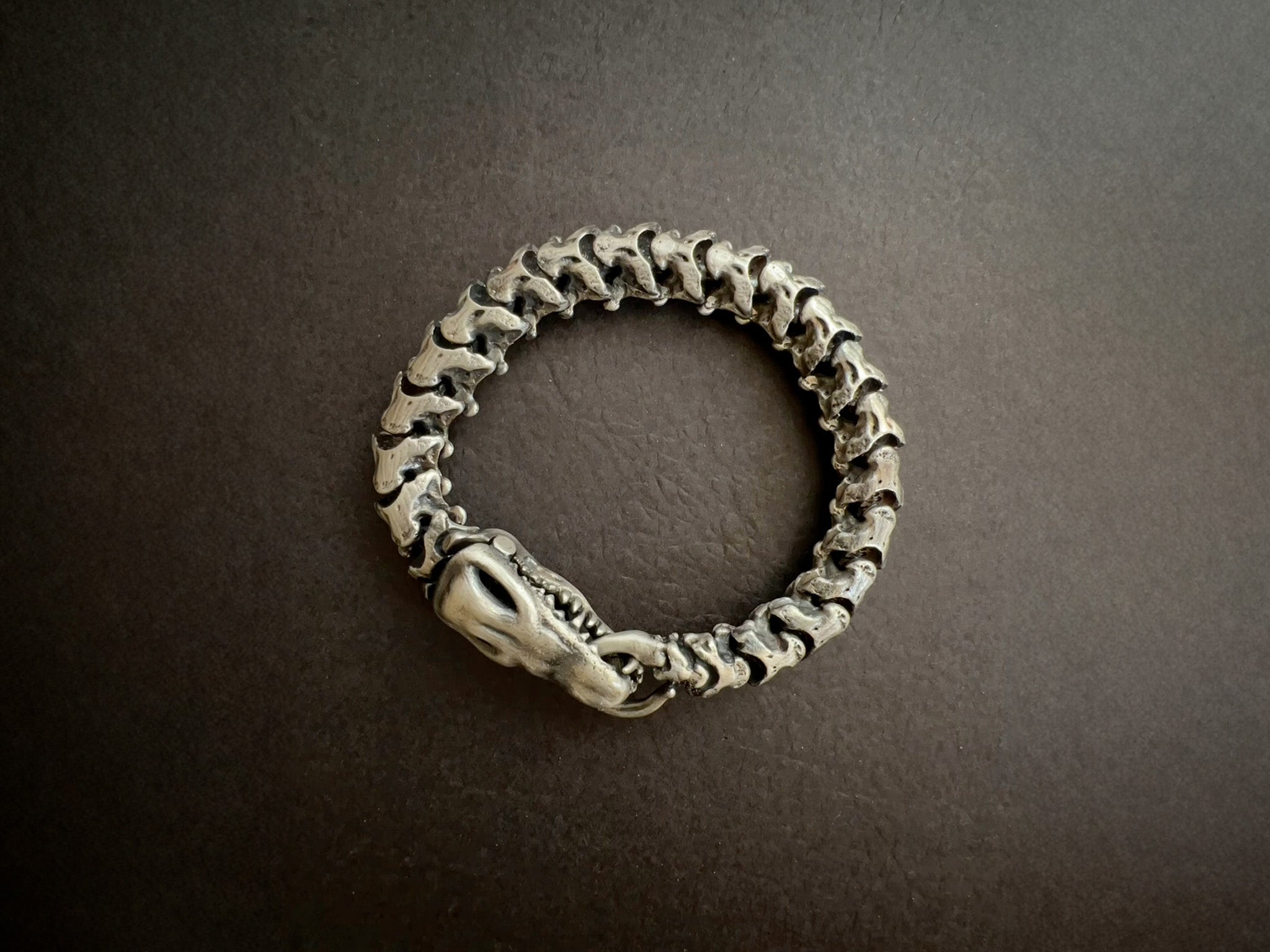 Dieses Armband aus Sterlingsilber besticht durch sein präzise gefertigtes Design, das von den anmutigen Kurven der Schlangenwirbel inspiriert ist. Jedes Stück zeugt von sorgfältiger Handwerkskunst und vereint auf einzigartige Weise naturnahe Kunstfertigkeit mit zeitloser Eleganz. Verleihen Sie Ihrem Stil mit diesem handgefertigten Meisterwerk, das Eleganz und Individualität perfekt vereint, das gewisse Etwas.Entworfen und handgefertigt von Anatoly Startsev aus Sterlingsilber.