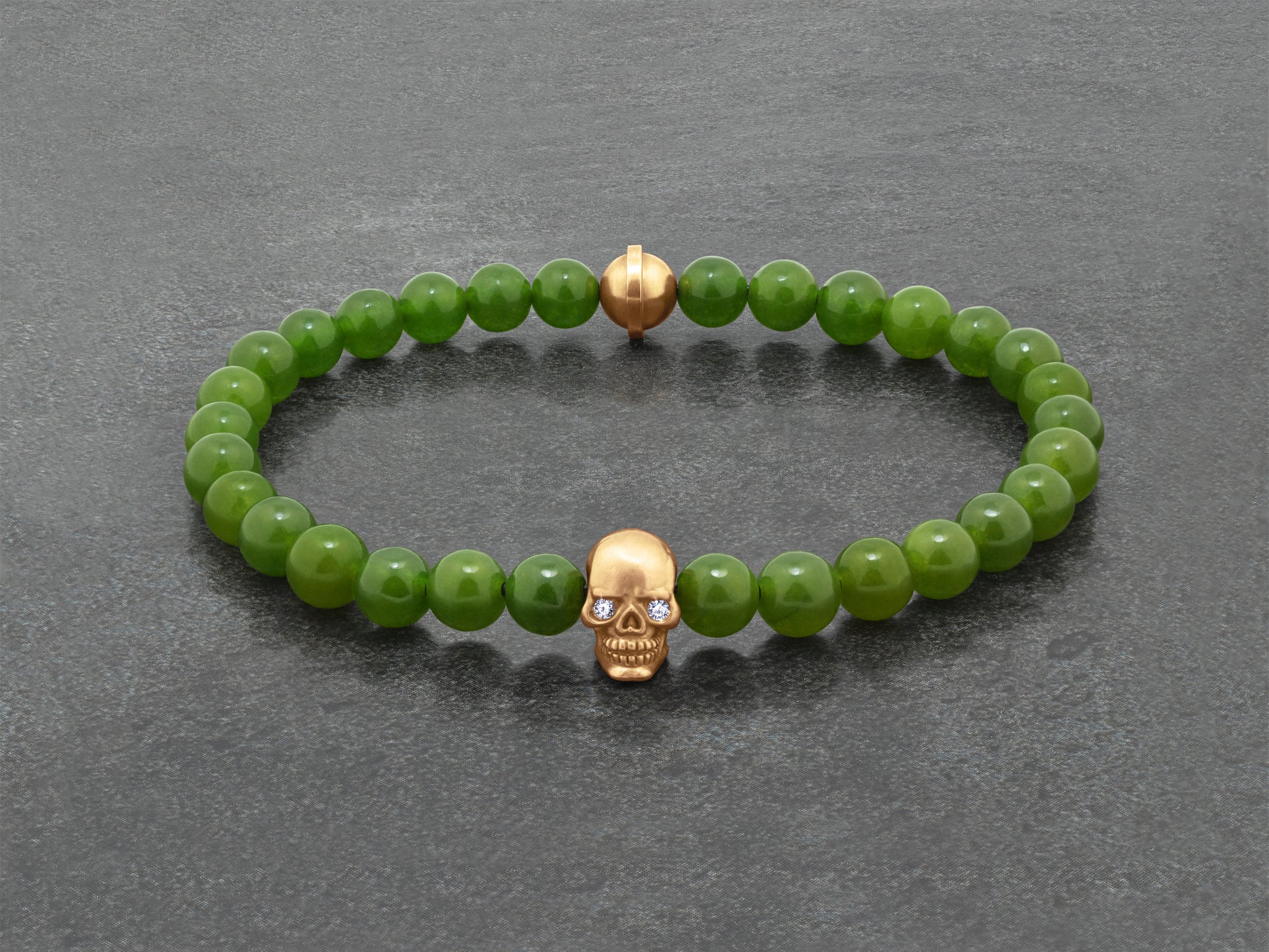 Unsere luxuriöse Interpretation des allseits beliebten Armbands besticht durch eine Kette aus grünen Jadeperlen, die wunderschön mit Roségold kombiniert werden. Der handgefertigte Totenkopf ist mit zwei perfekt geschliffenen Diamanten als Augen besetzt. Das Armband lässt sich dank des elastischen Bandes kinderleicht an- und ablegen. Jedes Stück wird von einem Meisterhandwerker in unserem New Yorker Atelier gefertigt.