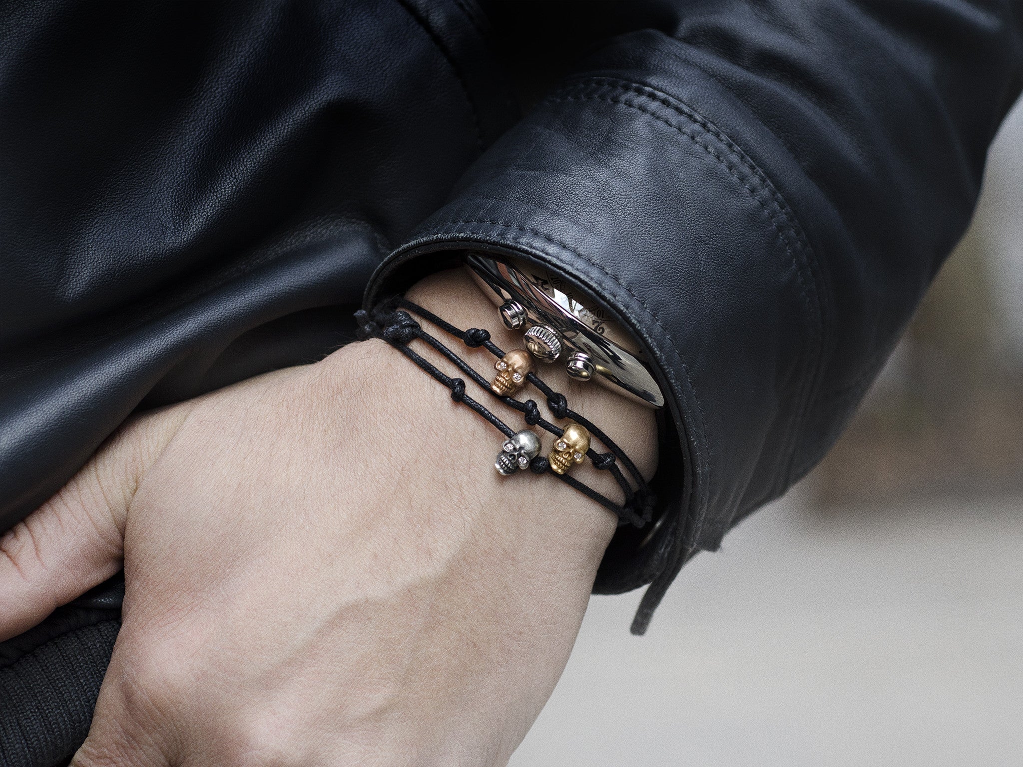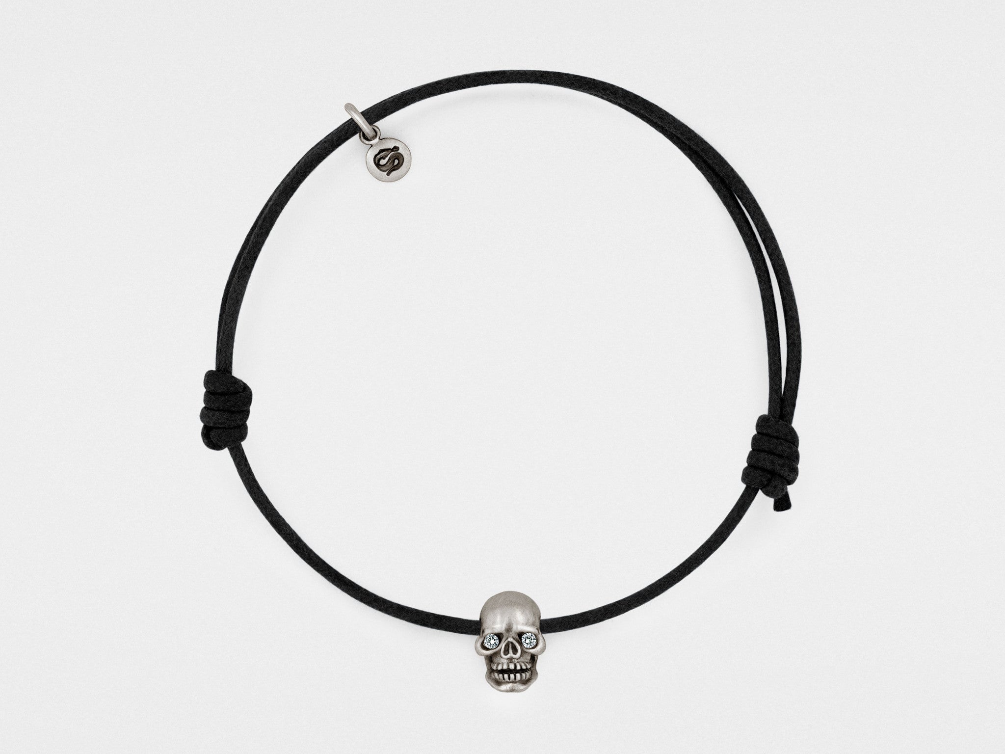 - Massives 925er Sterlingsilber, gewachste Baumwollkordel. Totenköpfe mit Diamanten der Farbe FG und Reinheit SI1 in polierter Fassung. Gesamtgewicht der Diamanten: 0,06 ct.