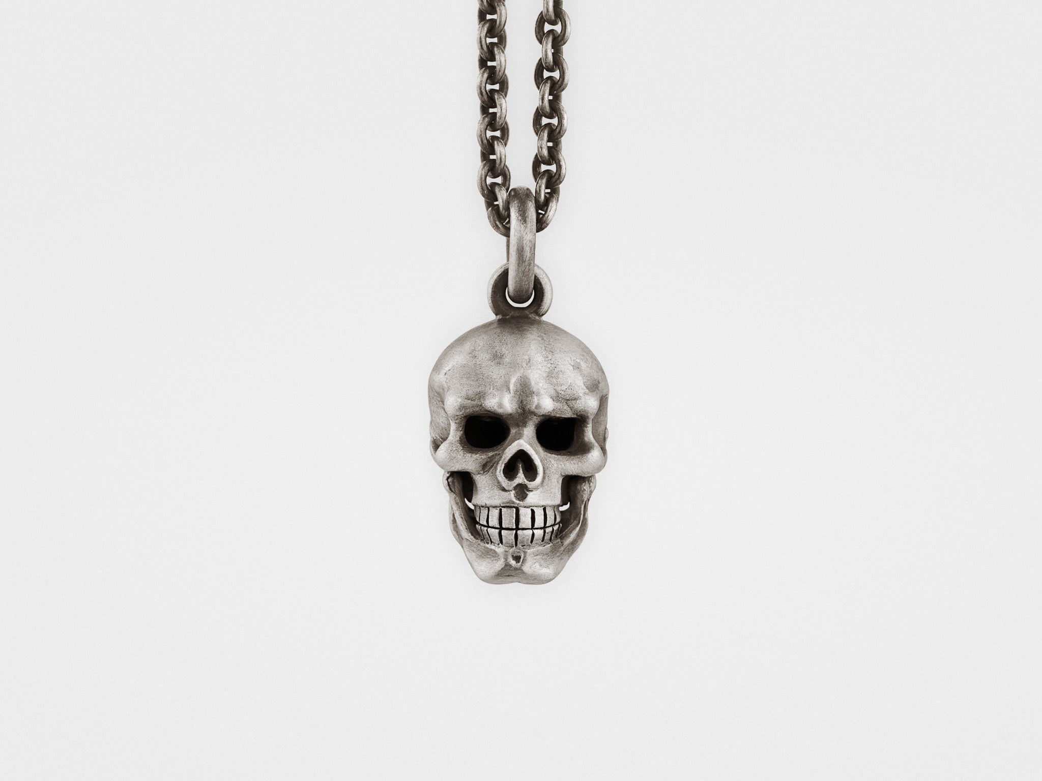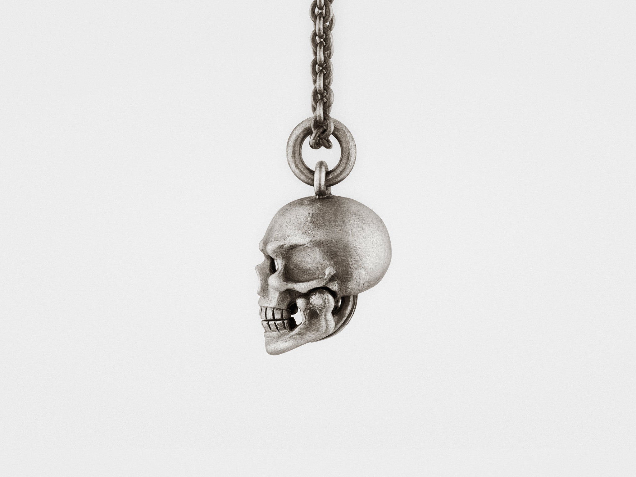 Zeigen Sie Ihre rebellische Seite mit diesem luxuriösen Anhänger. Der bewegliche Unterkiefer des Totenkopfes verleiht diesem fein gearbeiteten Schmuckstück eine verspielte Note, da er sich bei jeder Bewegung öffnet und schließt. Jedes Stück ist handgefertigt aus oxidiertem Silber und besticht durch seinen Vintage-Look und die einzigartige Patina.