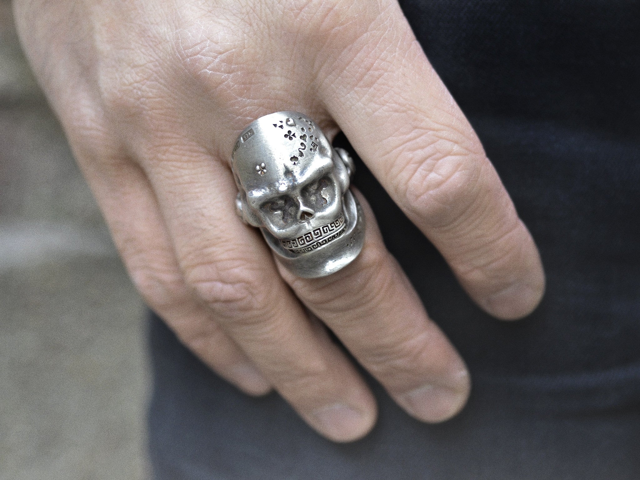 Dieser Ring, ein originelles Biker-/Rocker-Design von Anatoly Startsev, besticht durch seinen großen, hochwertigen Totenkopfring mit einzigartigem, aufklappbarem Mund und Spielkartenmotiv. Jeder Ring wird sorgfältig von Hand gefertigt und ist somit ein unverwechselbares Unikat.