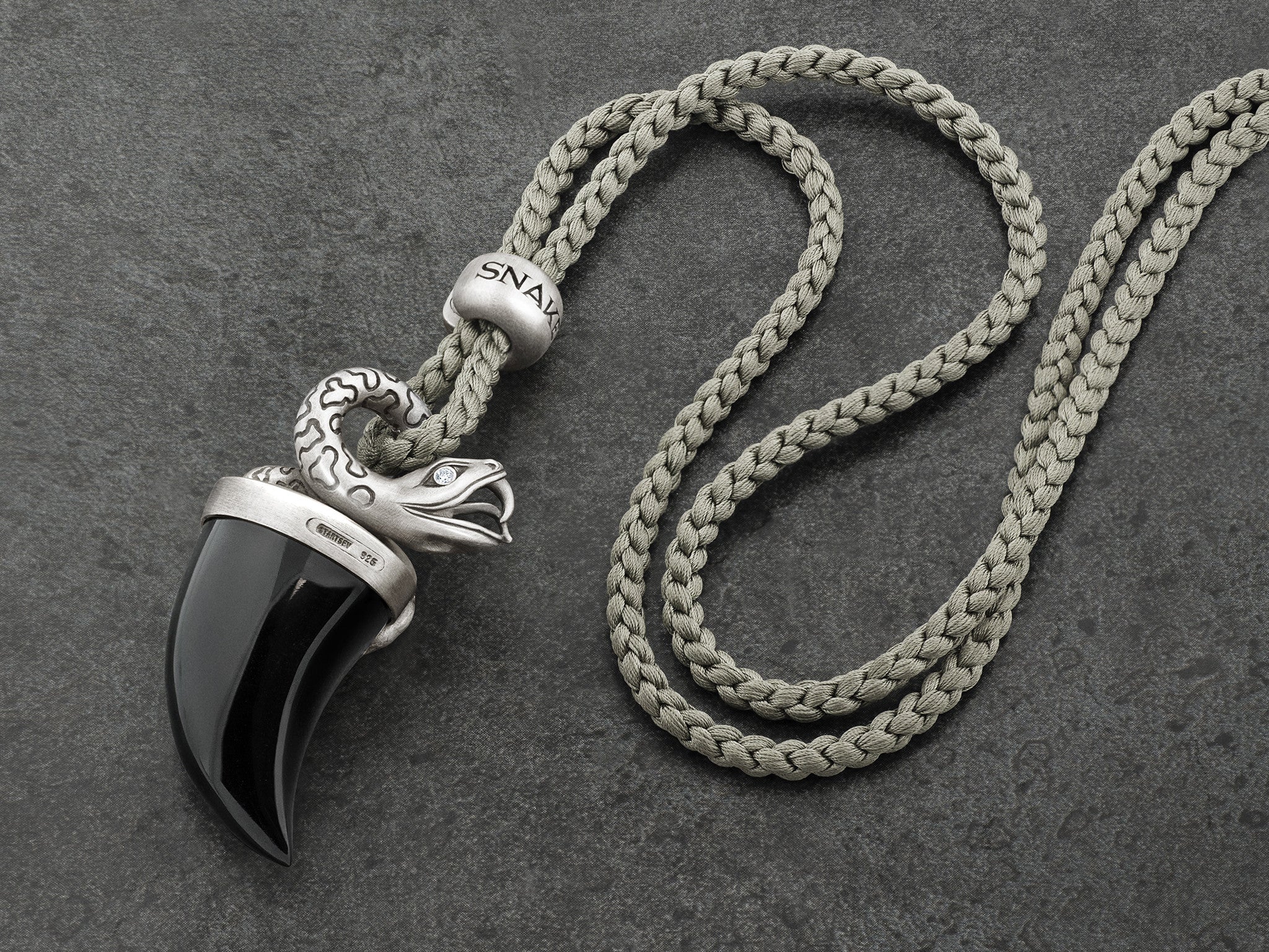 Setzen Sie ein bleibendes Statement mit dieser luxuriösen, handgeschnitzten Schlangenhalskette aus schwarzem Onyx in Sterlingsilber mit Diamantaugen.