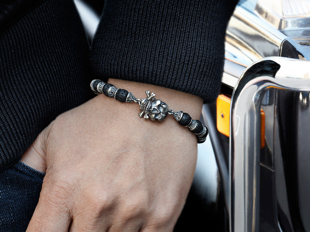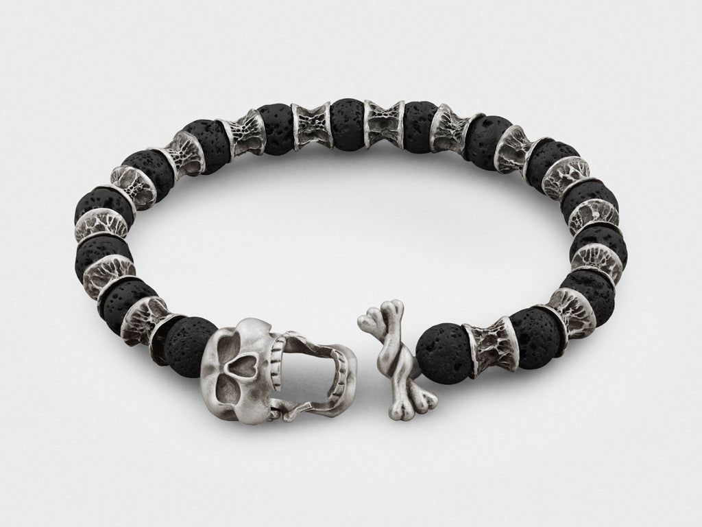 Silbernes Totenkopf- und Knochenarmband mit Lavaperlen